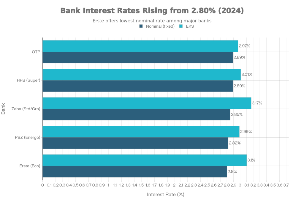 Velike banke u Hrvatskoj trenutačno se natječu tko će imati atraktivniju fiksnu kamatnu stopu, osobito za “zelene” i energetski učinkovite nekretnine. U praksi to znači da se najbolje fiksne kamate za klijente s urednim primanjima kreću otprilike između 2,8% i 3,2% godišnje, ovisno o banci, vrsti nekretnine i paketu proizvoda koji uzimaš (plaća preko banke, osiguranje, kartice i slično).